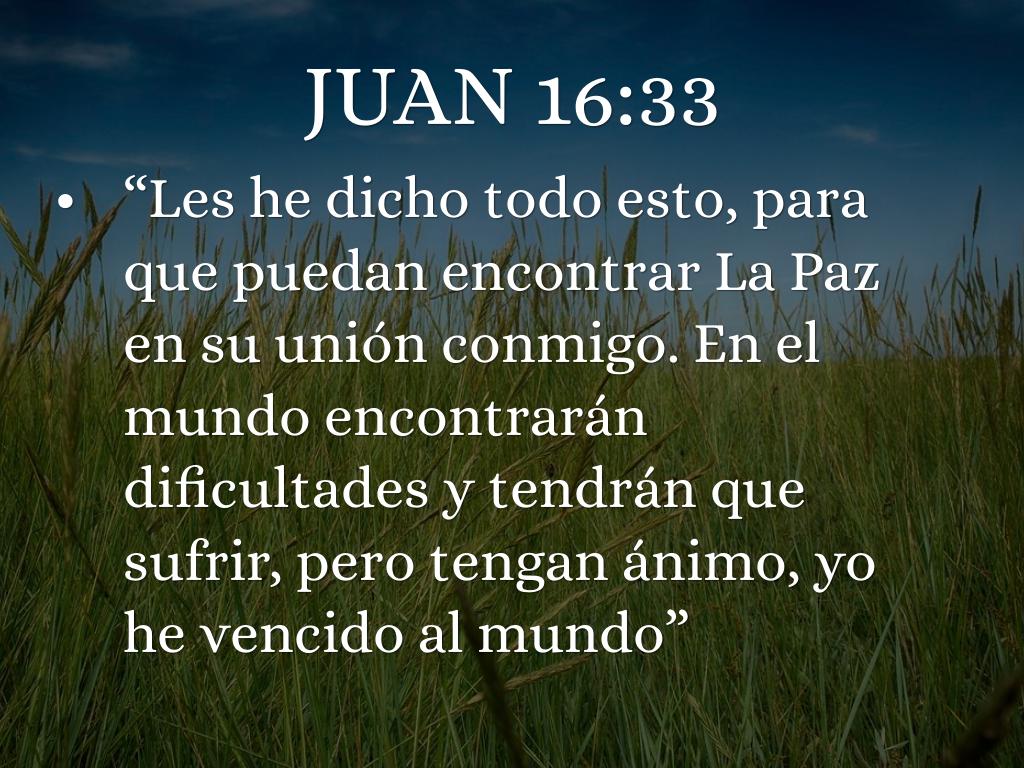 • “Les he dicho todo esto, para que puedan encontrar La Paz en su unión conmigo. En el mundo encontrarán dificultades y tendrán que sufrir, pero tengan ánimo, yo he vencido al mundo”