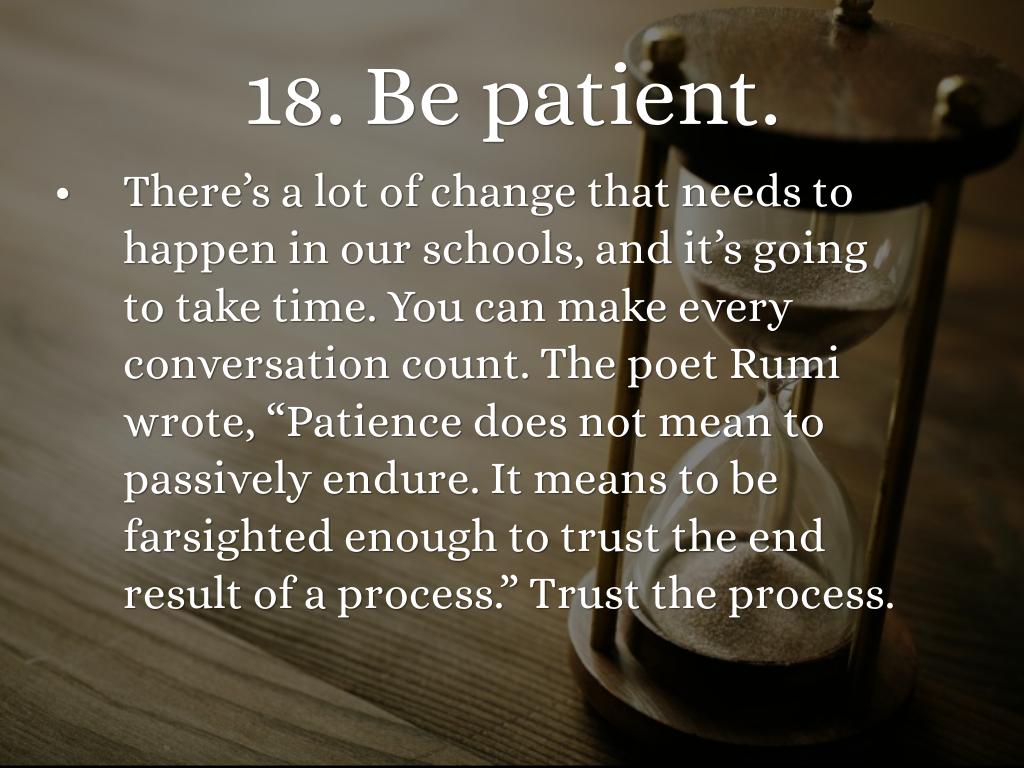 There’s a lot of change that needs to happen in our schools, and it’s going to take time. You can make every conversation count. The poet Rumi wrote, “Patience does not mean to passively endure. It means to be farsighted enough to trust the end result of a process.” Trust the process.