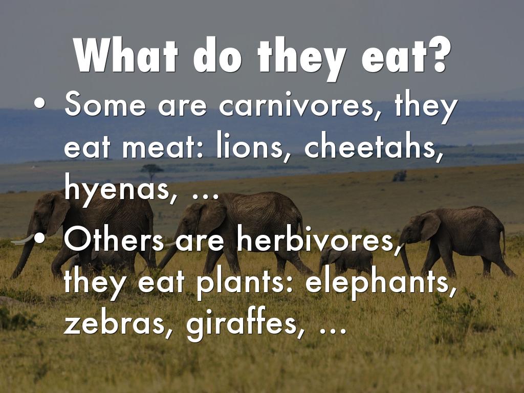 Some are carnivores, they eat meat: lions, cheetahs, hyenas, ...