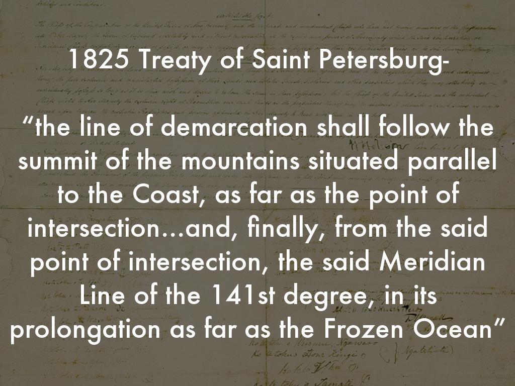 “the line of demarcation shall follow the summit of the mountains situated parallel to the Coast, as far as the point of intersection…and, finally, from the said point of intersection, the said Meridian Line of the 141st degree, in its prolongation as far as the Frozen Ocean”