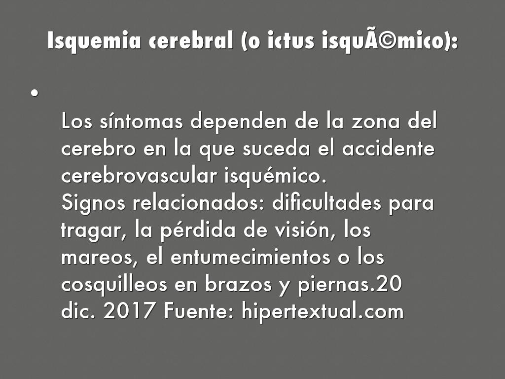 Los síntomas dependen de la zona del cerebro en la que suceda el accidente cerebrovascular isquémico. Signos relacionados: dificultades para tragar, la pérdida de visión, los mareos, el entumecimientos o los cosquilleos en brazos y piernas.20 dic. 2017 Fuente: hipertextual.com