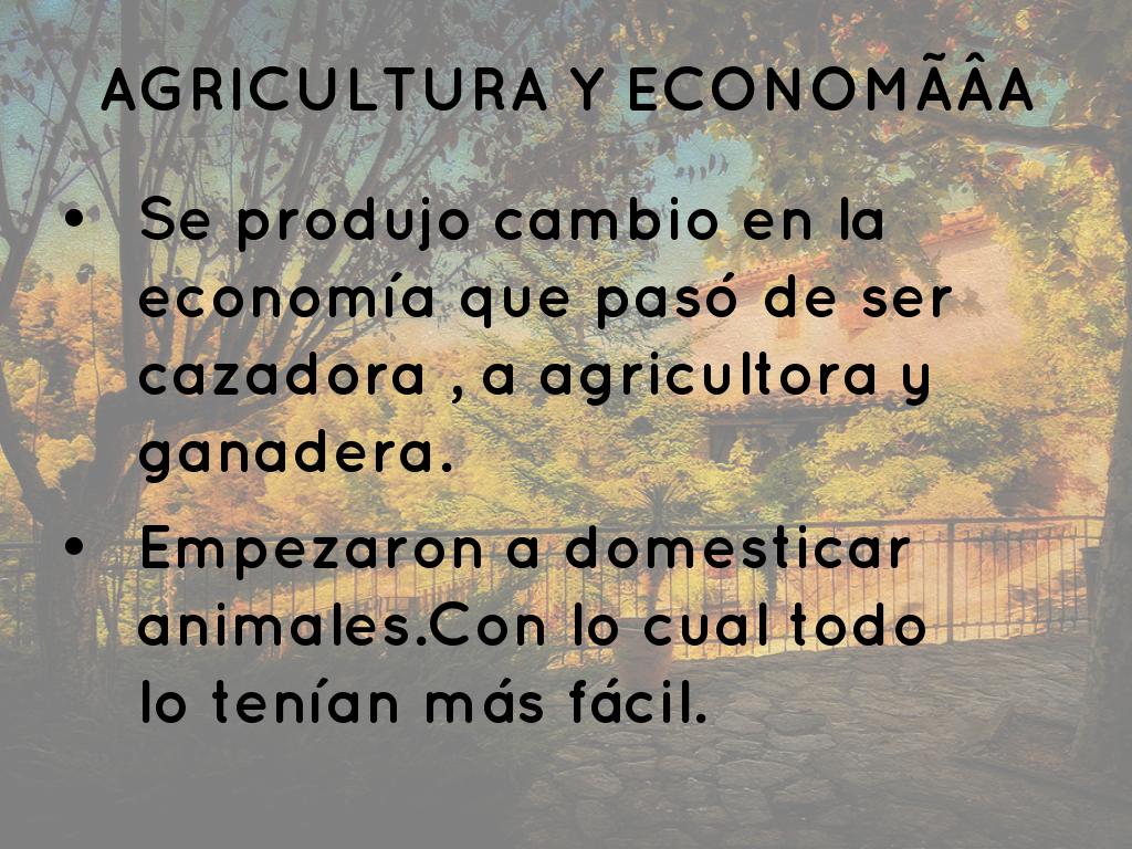 Neolítico :"Piedra nueva". Se descubrió la agricultura y ganadería.Empezó a ser una economía productora, se fueron a poblados es decir que empezaron a ser sedentarios.