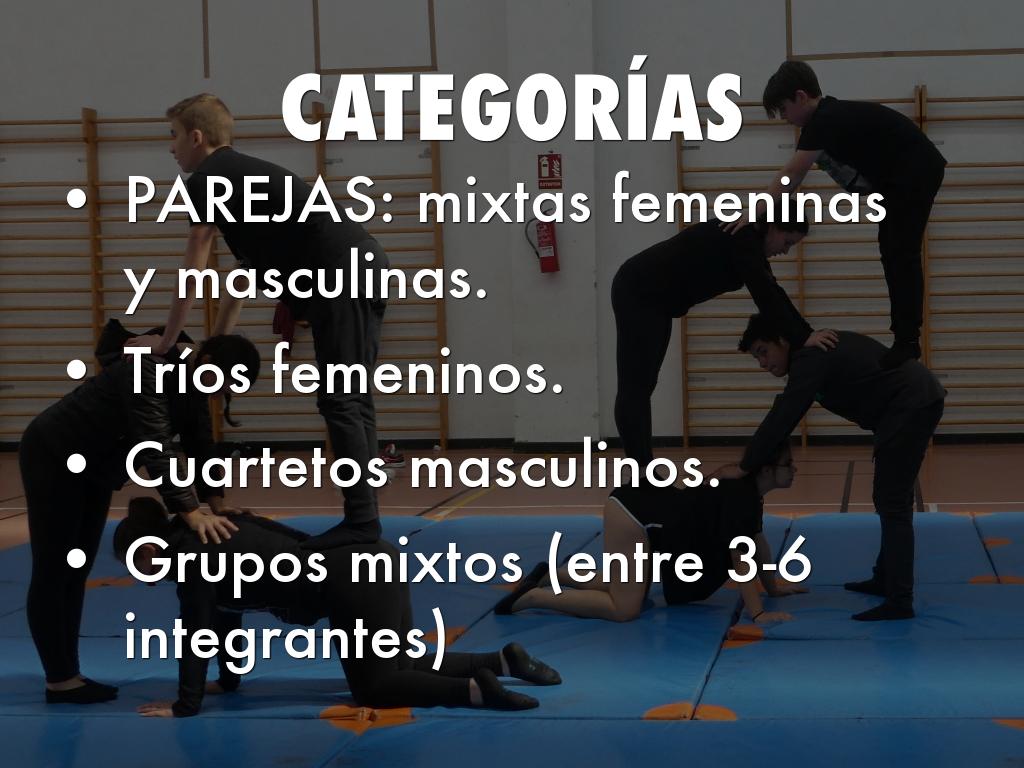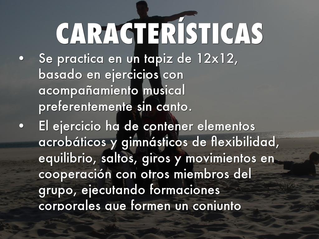 El ejercicio ha de contener elementos acrobáticos y gimnásticos de flexibilidad, equilibrio, saltos, giros y movimientos en cooperación con otros miembros del grupo, ejecutando formaciones corporales que formen un conjunto armónico.