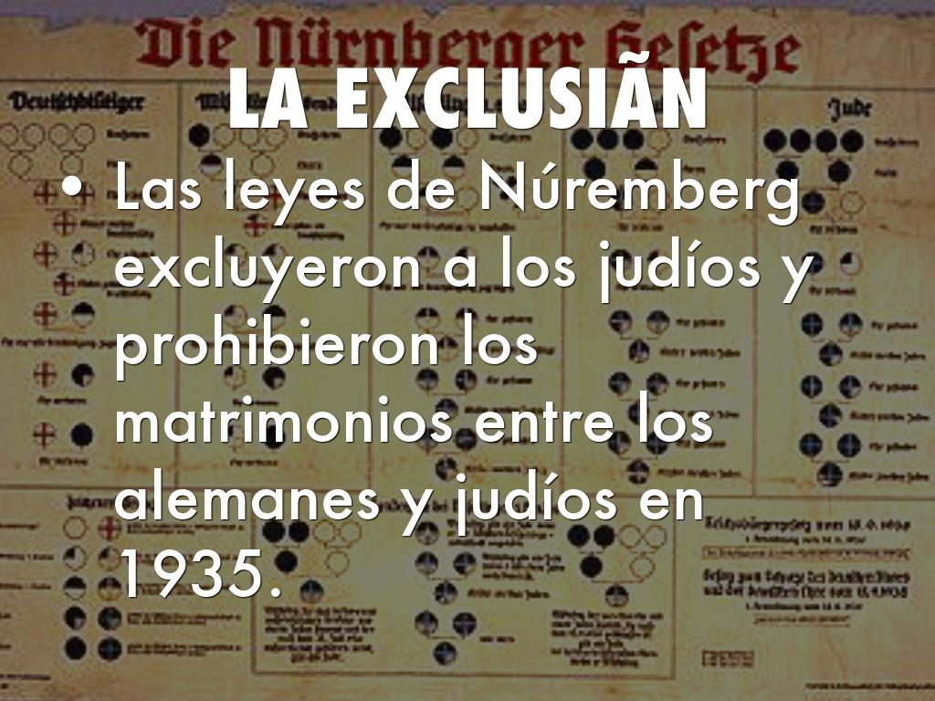 - Las leyes de Núremberg excluyeron a los judíos y prohibieron los matrimonios entre los alemanes y judíos en 1935.