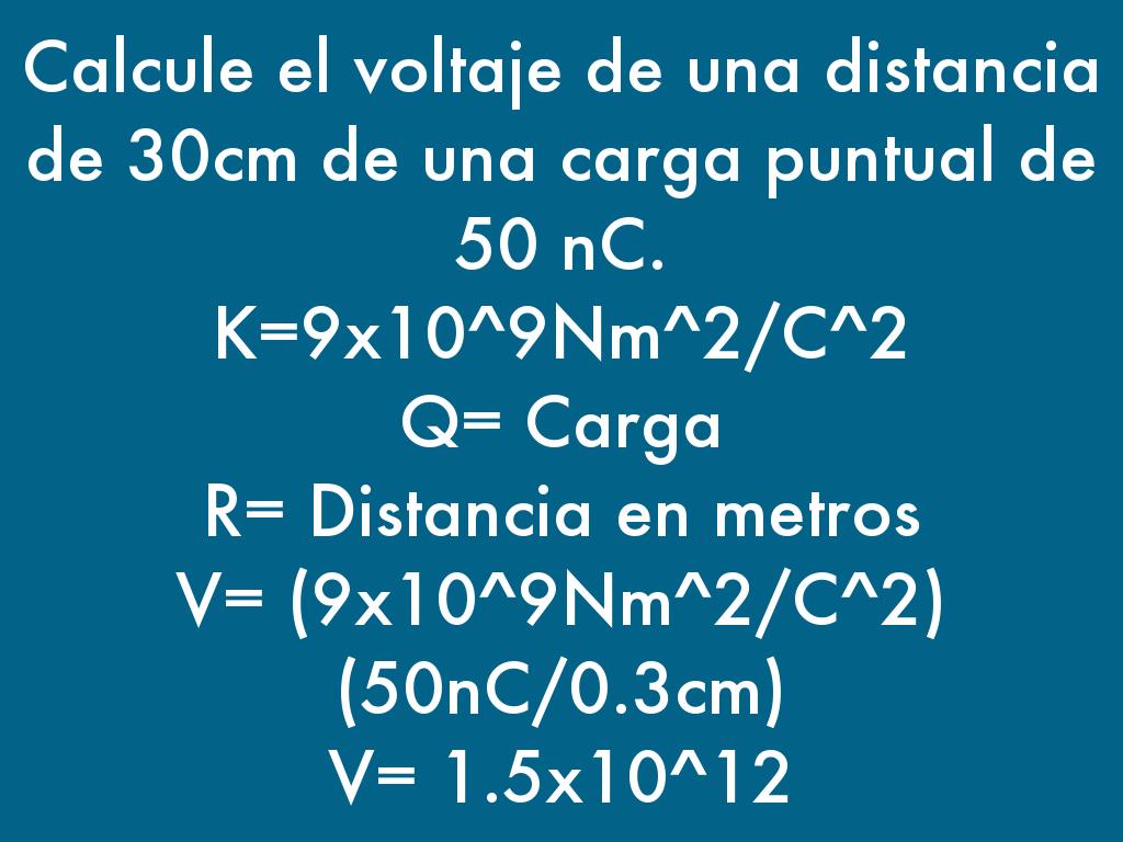Calcule el voltaje de una distancia de 30cm de una carga puntual de 50 nC.