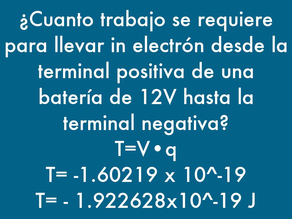 ¿Cuanto trabajo se requiere para llevar in electrón desde la terminal positiva de una batería de 12V hasta la terminal negativa?