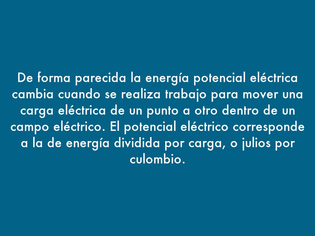 De forma parecida la energía potencial eléctrica cambia cuando se realiza trabajo para mover una carga eléctrica de un punto a otro dentro de un campo eléctrico. El potencial eléctrico corresponde a la de energía dividida por carga, o julios por culombio.