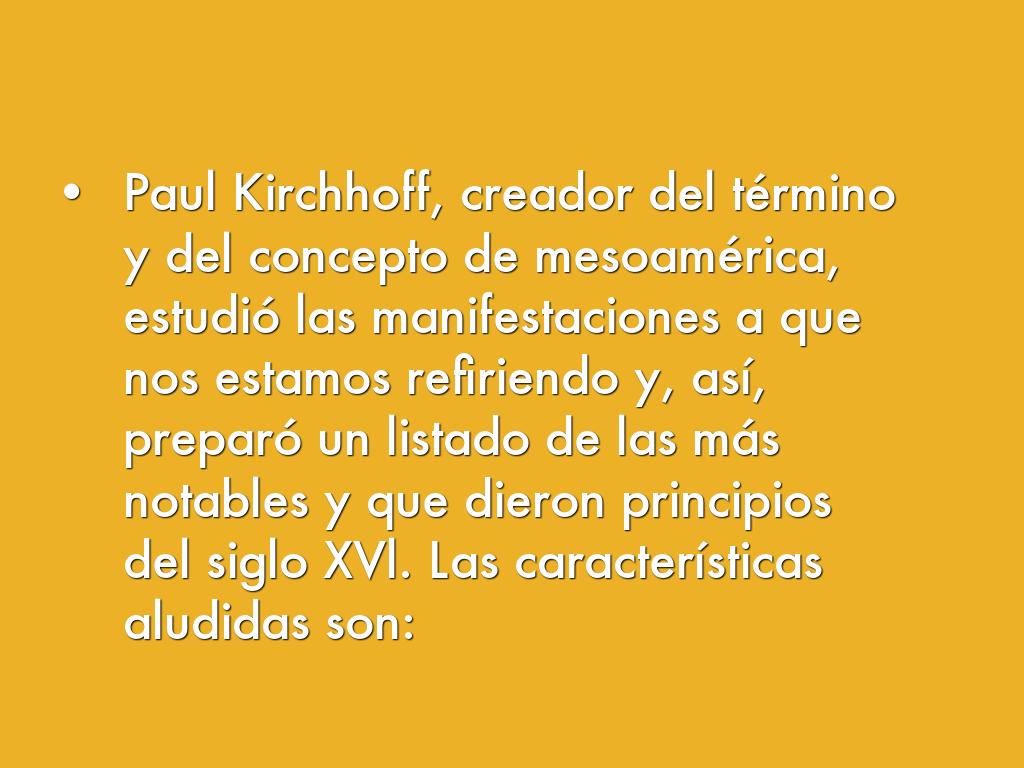 Paul Kirchhoff, creador del término y del concepto de mesoamérica, estudió las manifestaciones a que nos estamos refiriendo y, así, preparó un listado de las más notables y que dieron principios del siglo XVl. Las características aludidas son: