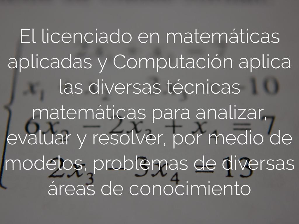 El licenciado en matemáticas aplicadas y Computación aplica las diversas técnicas matemáticas para analizar, evaluar y resolver, por medio de modelos, problemas de diversas áreas de conocimiento