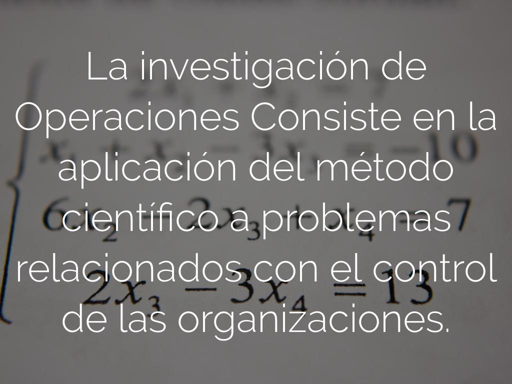La investigación de Operaciones Consiste en la aplicación del método científico a problemas relacionados con el control de las organizaciones.