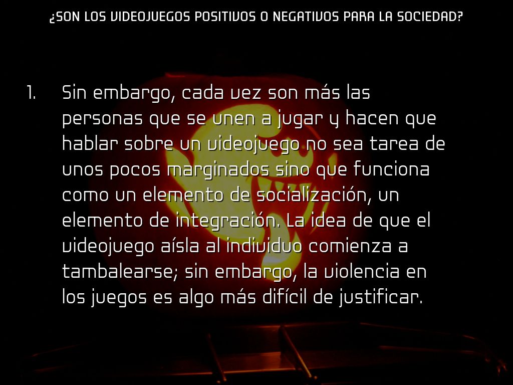Sin embargo, cada vez son más las personas que se unen a jugar y hacen que hablar sobre un videojuego no sea tarea de unos pocos marginados sino que funciona como un elemento de socialización, un elemento de integración. La idea de que el videojuego aísla al individuo comienza a tambalearse; sin embargo, la violencia en los juegos es algo más difícil de justificar.