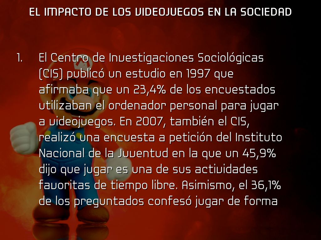 El Centro de Investigaciones Sociológicas (CIS) publicó un estudio en 1997 que afirmaba que un 23,4% de los encuestados utilizaban el ordenador personal para jugar a videojuegos. En 2007, también el CIS, realizó una encuesta a petición del Instituto Nacional de la Juventud en la que un 45,9% dijo que jugar es una de sus actividades favoritas de tiempo libre. Asimismo, el 36,1% de los preguntados confesó jugar de forma habitual.