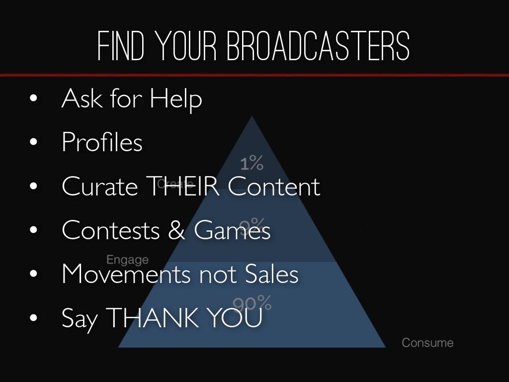 Finding those few, possibly on one or two, customer advocates and contributors capable of "broadcast diffusion" is why content, products, and brands "go viral".