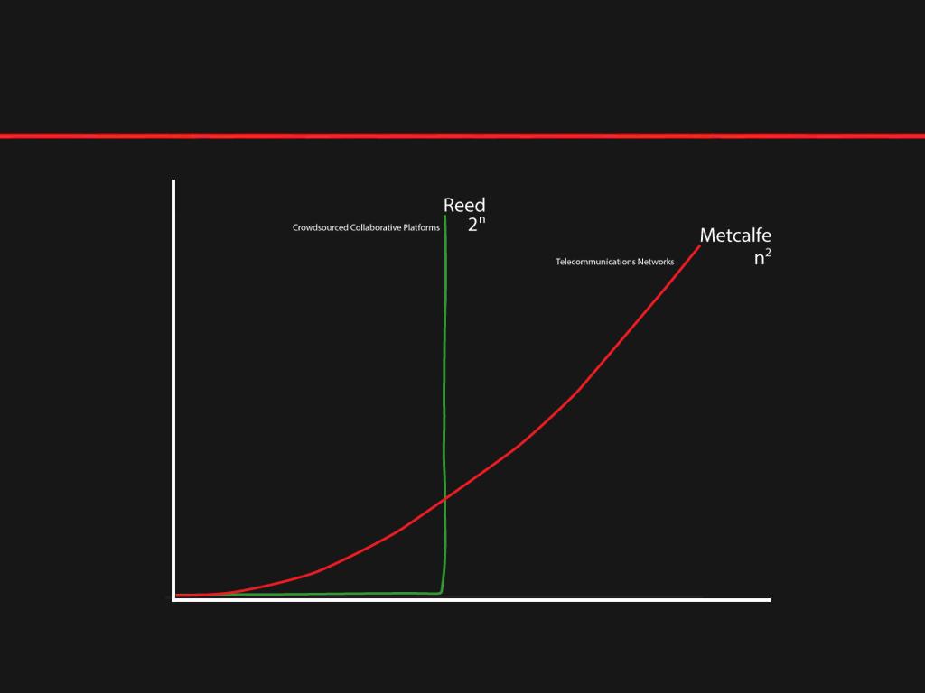 Reed's 2 x (n) where n = number of a networks' members show a Facebook or Twitter-like scale distribution. The reinforcing nature of the network produces a rapid exponential expansion.
