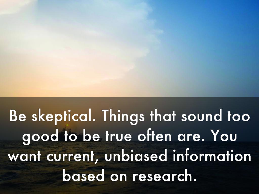 Be skeptical. Things that sound too good to be true often are. You want current, unbiased information based on research.