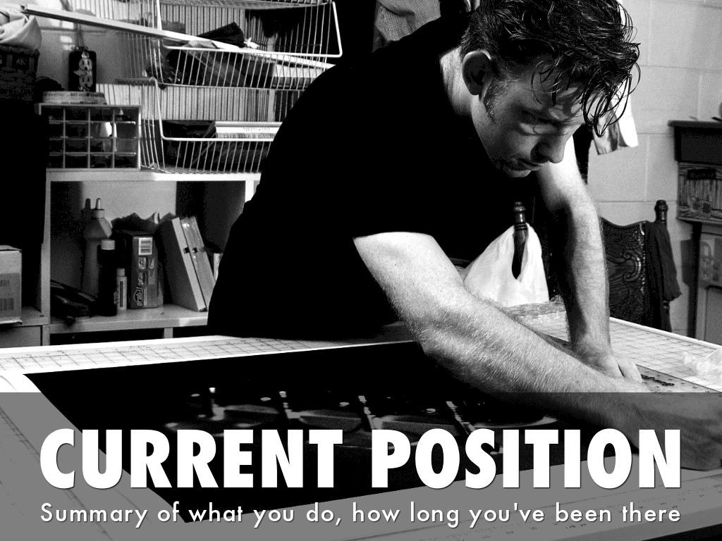 You can change the order of these slides, or add more that follow a similar format, to suit your need or mood, but it might be helpful to showcase your current role, summarizing your primary responsibilities and how long you've been part of the team.