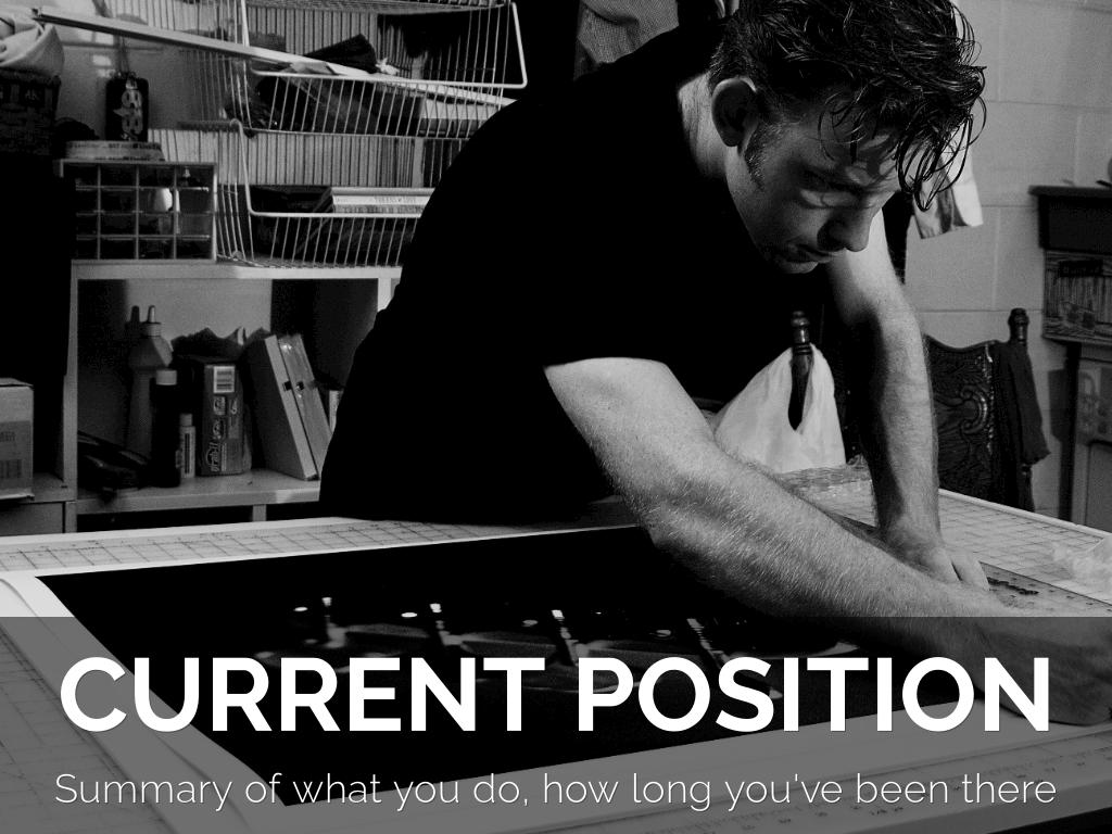 You can change the order of these slides, or add more that follow a similar format, to suit your need or mood, but it might be helpful to showcase your current role, summarizing your primary responsibilities and how long you've been part of the team.
