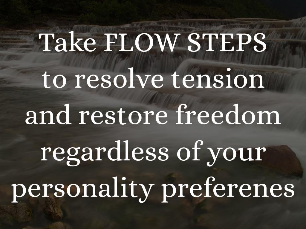 Flow Steps help you resolve your tension both in the dimensions of time and space. When you know what your natural preferences are, you can begin to take style-specific steps to integrate more Flow into your experience.