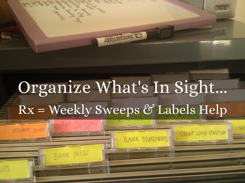 Organize surfaces often... You'll make the most progress with weekly sweeps and bold, colorful labels.