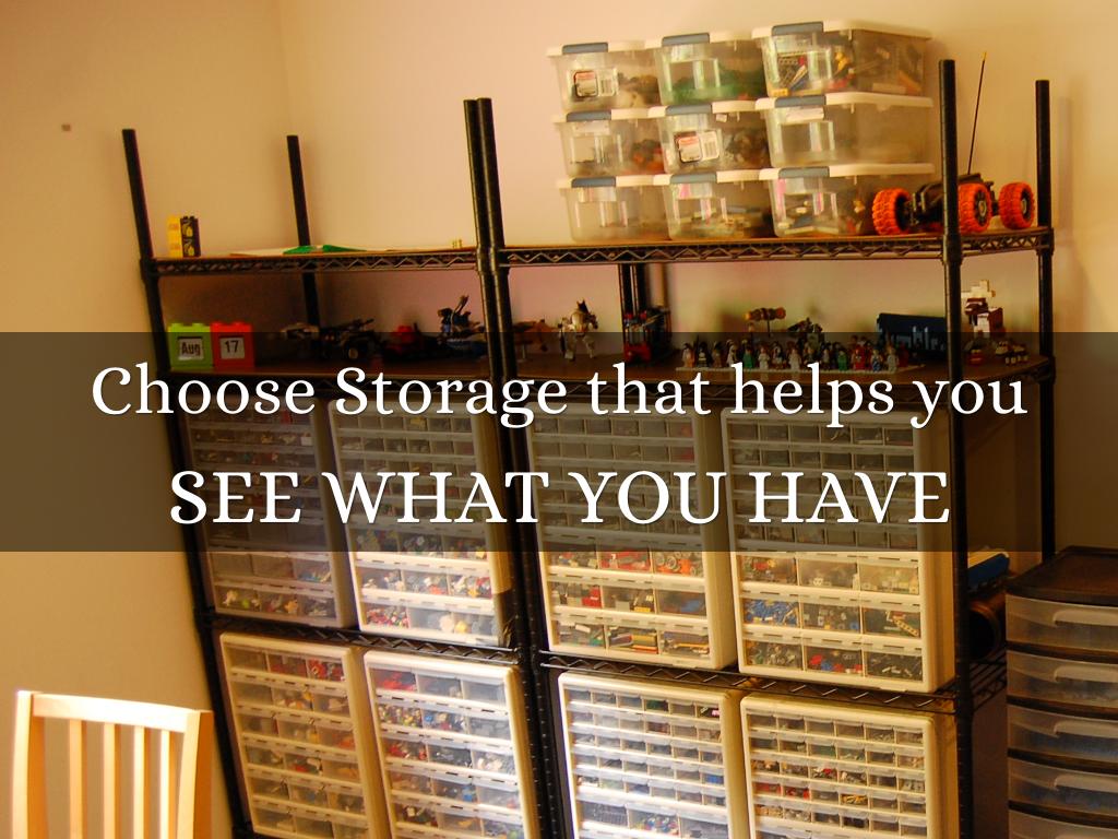Select organizational and storage products that provide maximum visibility so you can see and know exactly what you have and where things are. Visual cues work well for you - so aim for acrylic or see-through storage containers so you can 'see what you have'.