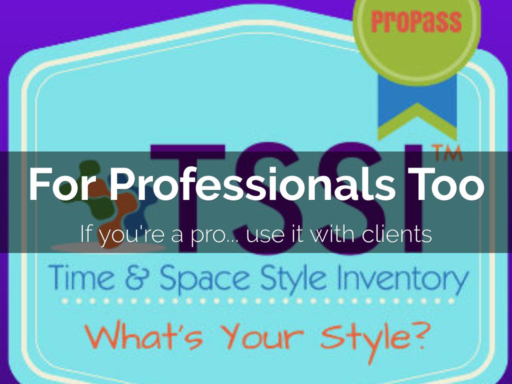 The Time & Space Style Inventory™ (TSSI™) evaluates your style preference and how you arrange space, tolerate disorder, and assign value. This helps you work with yourself to successfully manage your time and organize your space.