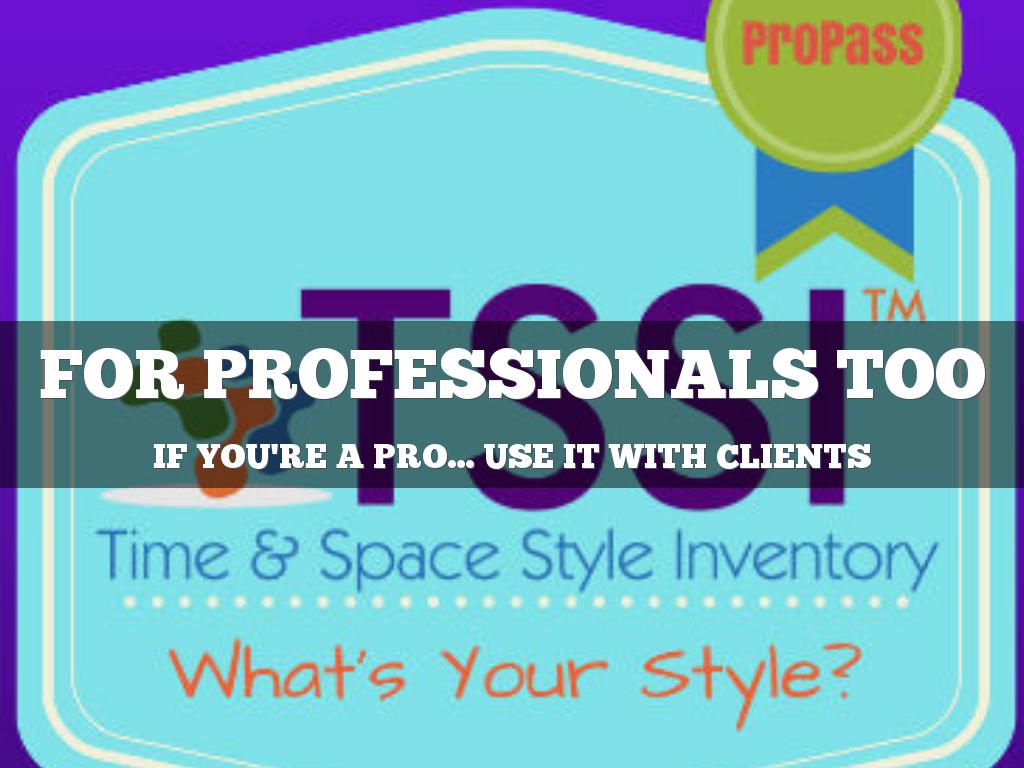 The Time & Space Style Inventory™ (TSSI™) evaluates your style preference and how you arrange space, tolerate disorder, and assign value. This helps you work with yourself to successfully manage your time and organize your space.