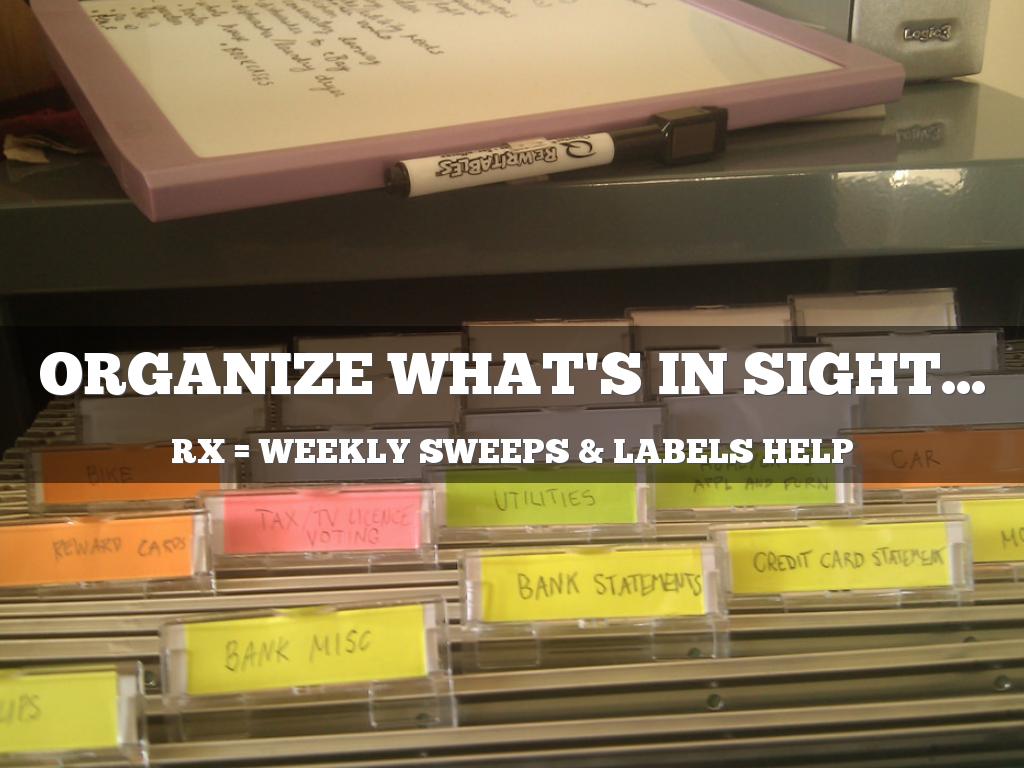Organize surfaces often... You'll make the most progress with weekly sweeps and bold, colorful labels.