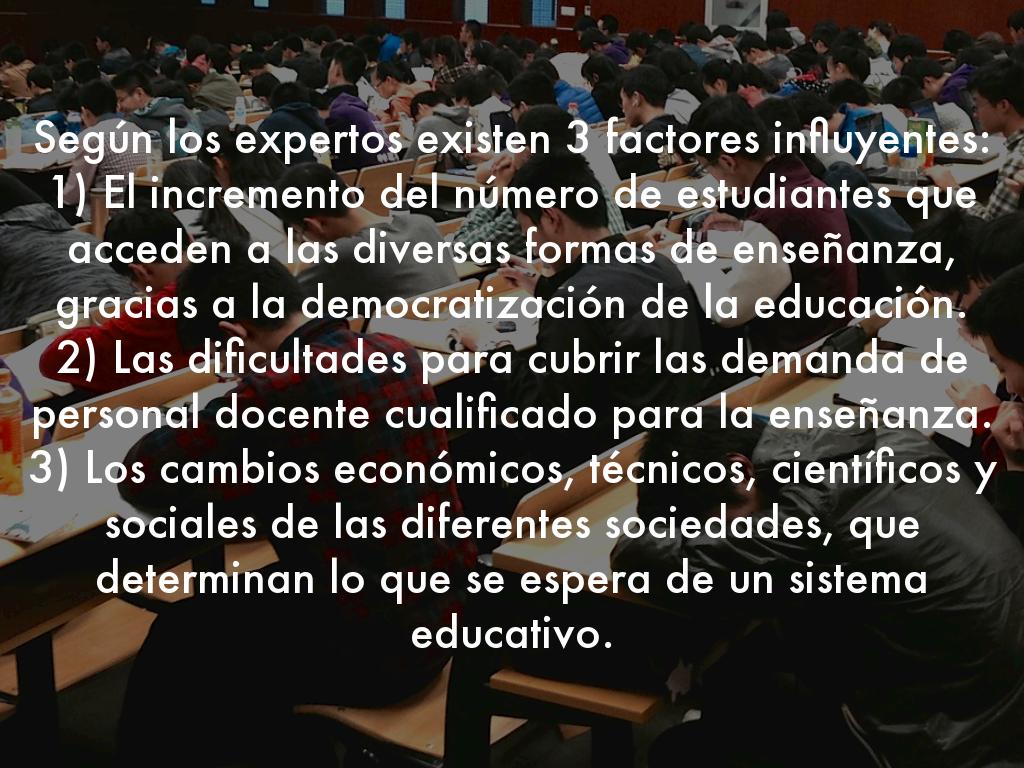 Según los expertos existen 3 factores influyentes: 1) El incremento del número de estudiantes que acceden a las diversas formas de enseñanza, gracias a la democratización de la educación. 2) Las dificultades para cubrir las demanda de personal docente cualificado para la enseñanza. 3) Los cambios económicos, técnicos, científicos y sociales de las diferentes sociedades, que determinan lo que se espera de un sistema educativo.