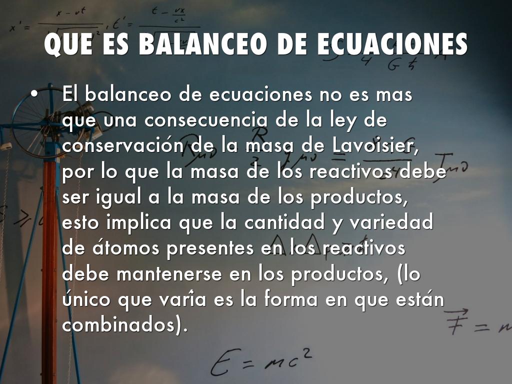 • El balanceo de ecuaciones no es mas que una consecuencia de la ley de conservación de la masa de Lavoisier, por lo que la masa de los reactivos debe ser igual a la masa de los productos, esto implica que la cantidad y variedad de átomos presentes en los reactivos debe mantenerse en los productos, (lo único que varía es la forma en que están combinados).
