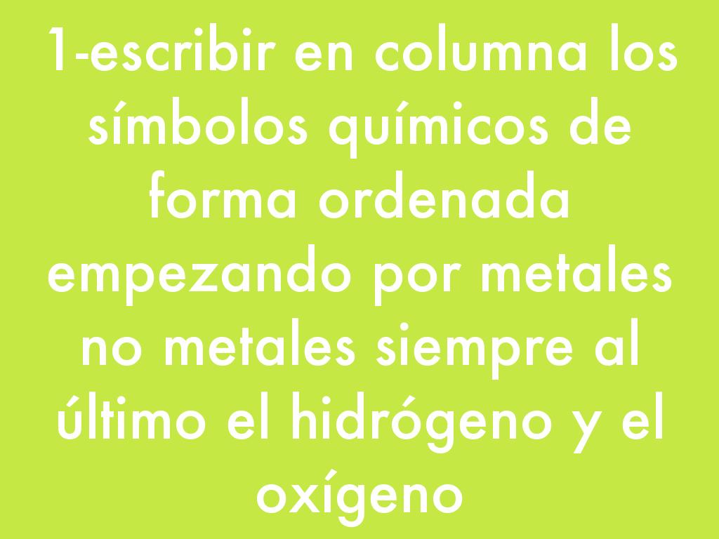 1-escribir en columna los símbolos químicos de forma ordenada empezando por metales no metales siempre al último el hidrógeno y el oxígeno