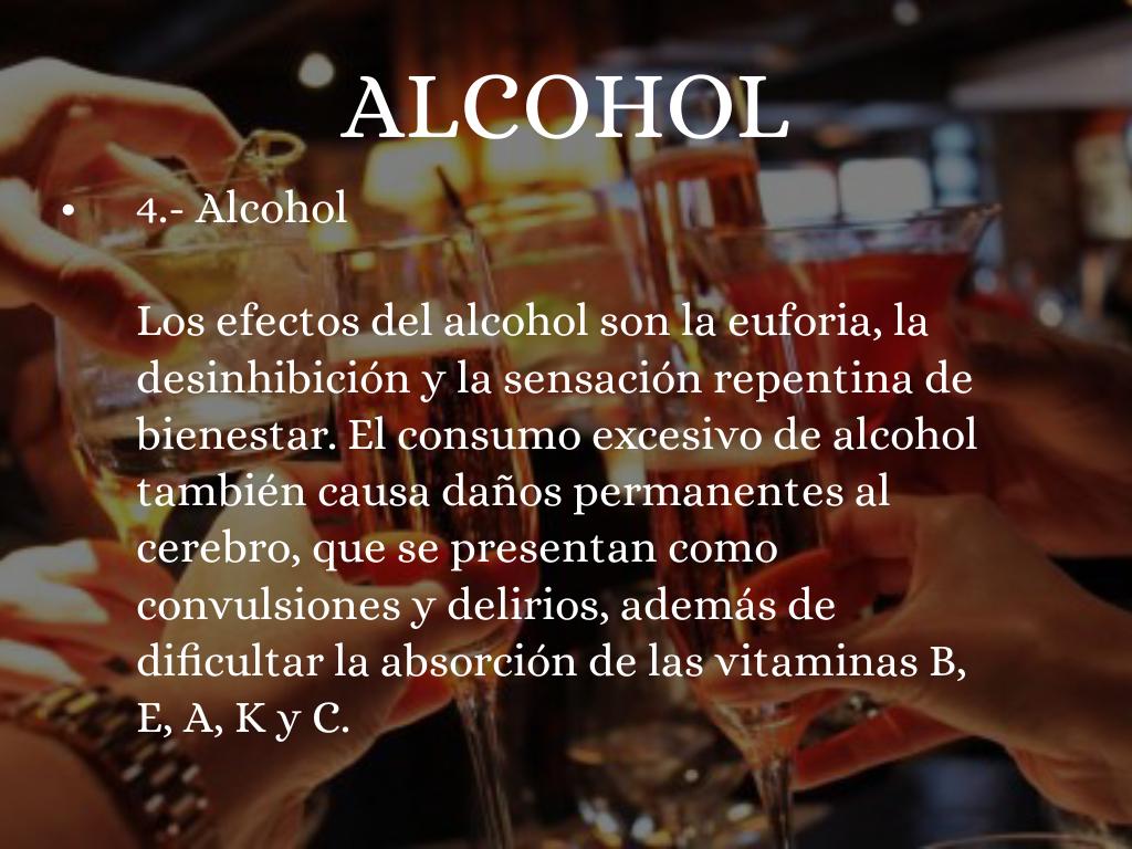 Los efectos del alcohol son la euforia, la desinhibición y la sensación repentina de bienestar. El consumo excesivo de alcohol también causa daños permanentes al cerebro, que se presentan como convulsiones y delirios, además de dificultar la absorción de las vitaminas B, E, A, K y C.