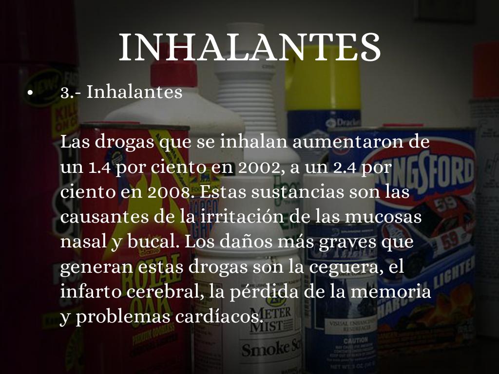 Las drogas que se inhalan aumentaron de un 1.4 por ciento en 2002, a un 2.4 por ciento en 2008. Estas sustancias son las causantes de la irritación de las mucosas nasal y bucal. Los daños más graves que generan estas drogas son la ceguera, el infarto cerebral, la pérdida de la memoria y problemas cardíacos.