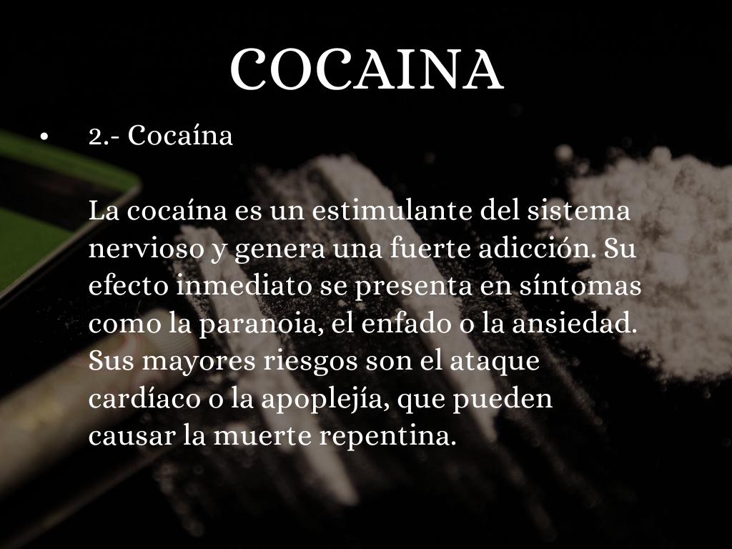 La cocaína es un estimulante del sistema nervioso y genera una fuerte adicción. Su efecto inmediato se presenta en síntomas como la paranoia, el enfado o la ansiedad. Sus mayores riesgos son el ataque cardíaco o la apoplejía, que pueden causar la muerte repentina.