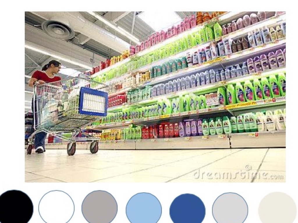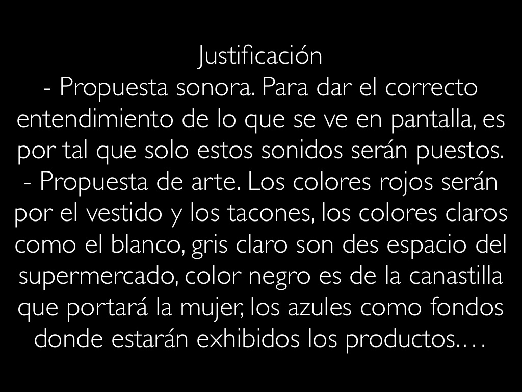 - Propuesta de arte. Los colores rojos serán por el vestido y los tacones, los colores claros como el blanco, gris claro son des espacio del supermercado, color negro es de la canastilla que portará la mujer, los azules como fondos donde estarán exhibidos los productos.