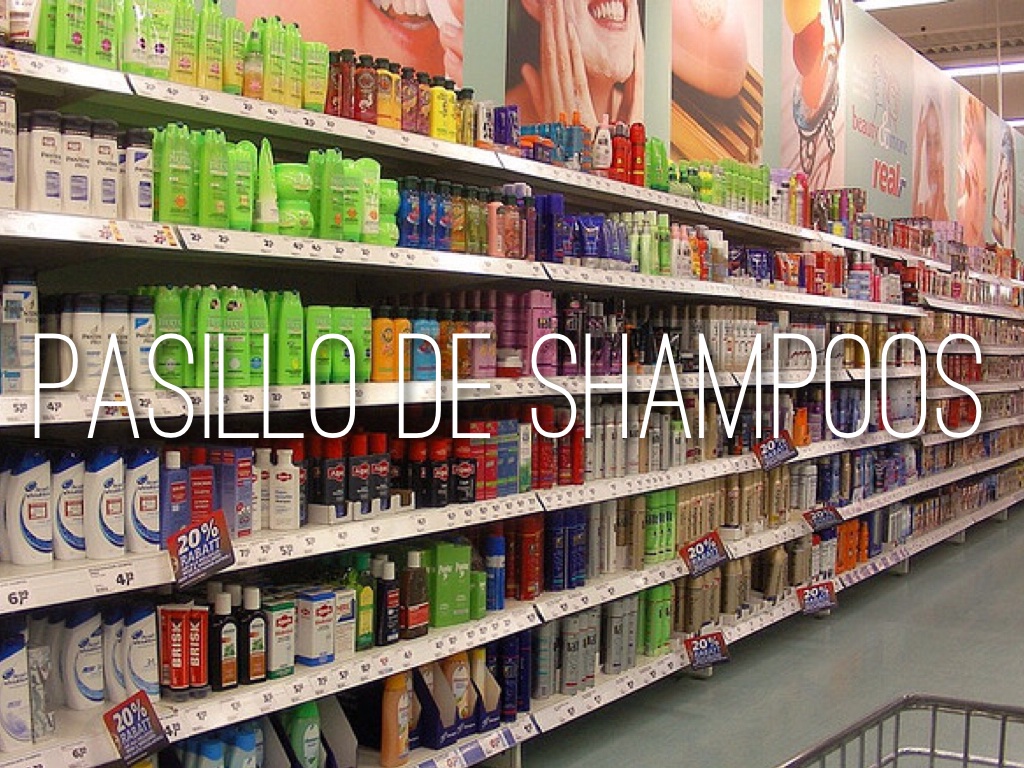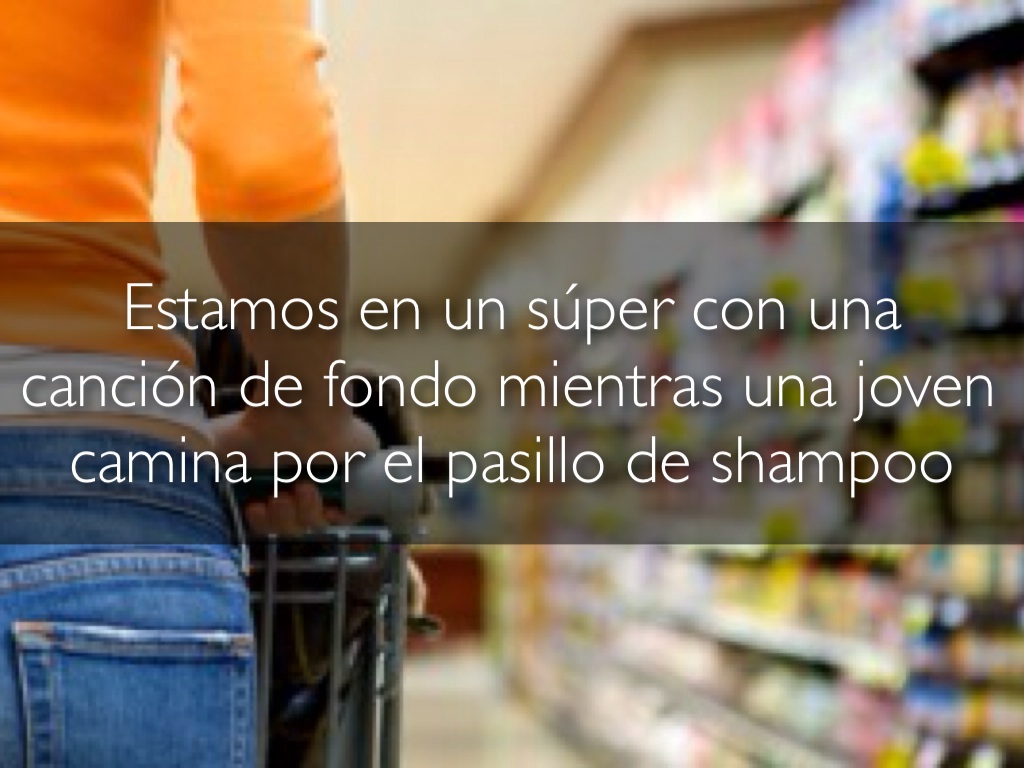 Estamos en un súper con una canción de fondo mientras una joven camina por el pasillo de shampoo