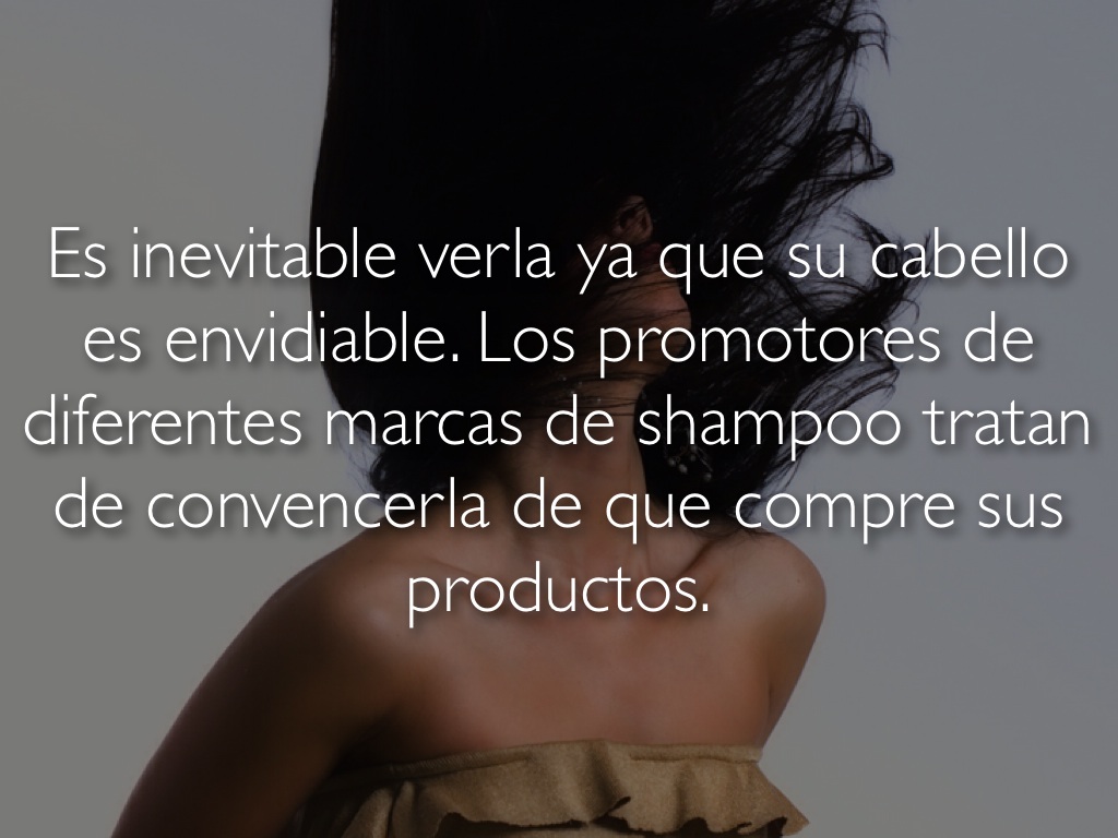 Es inevitable verla ya que su cabello es envidiable. Los promotores de diferentes marcas de shampoo tratan de convencerla de que compre sus productos.