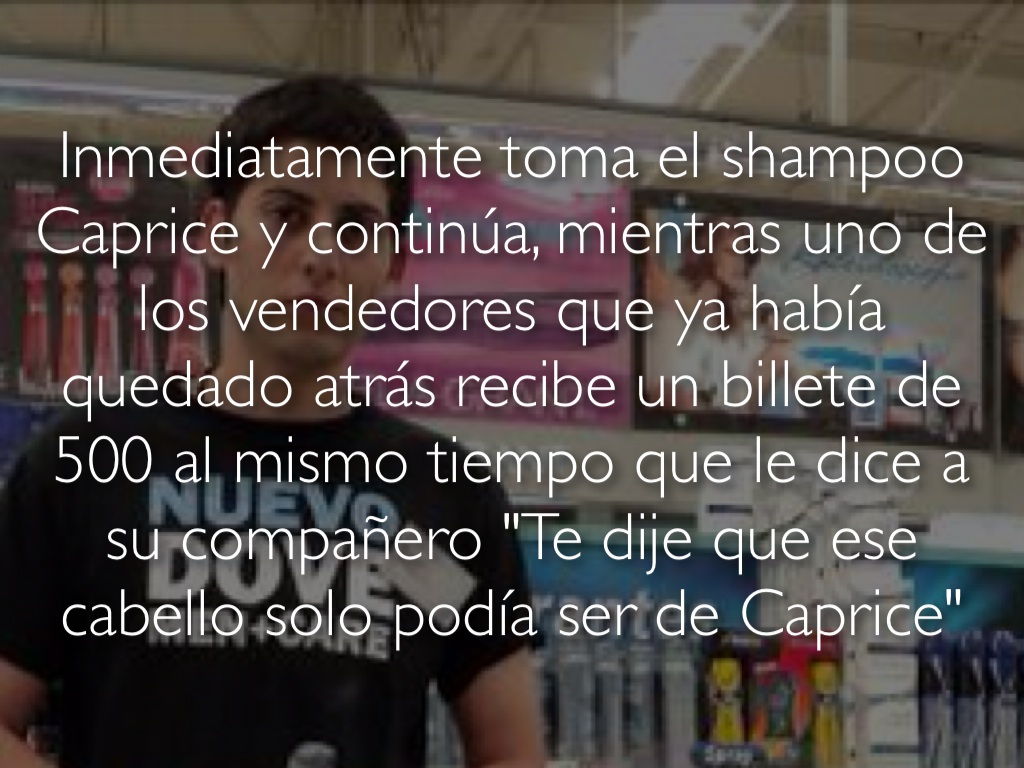 Inmediatamente toma el shampoo Caprice y continúa, mientras uno de los vendedores que ya había quedado atrás recibe un billete de 500 al mismo tiempo que le dice a su compañero "Te dije que ese cabello solo podía ser de Caprice"