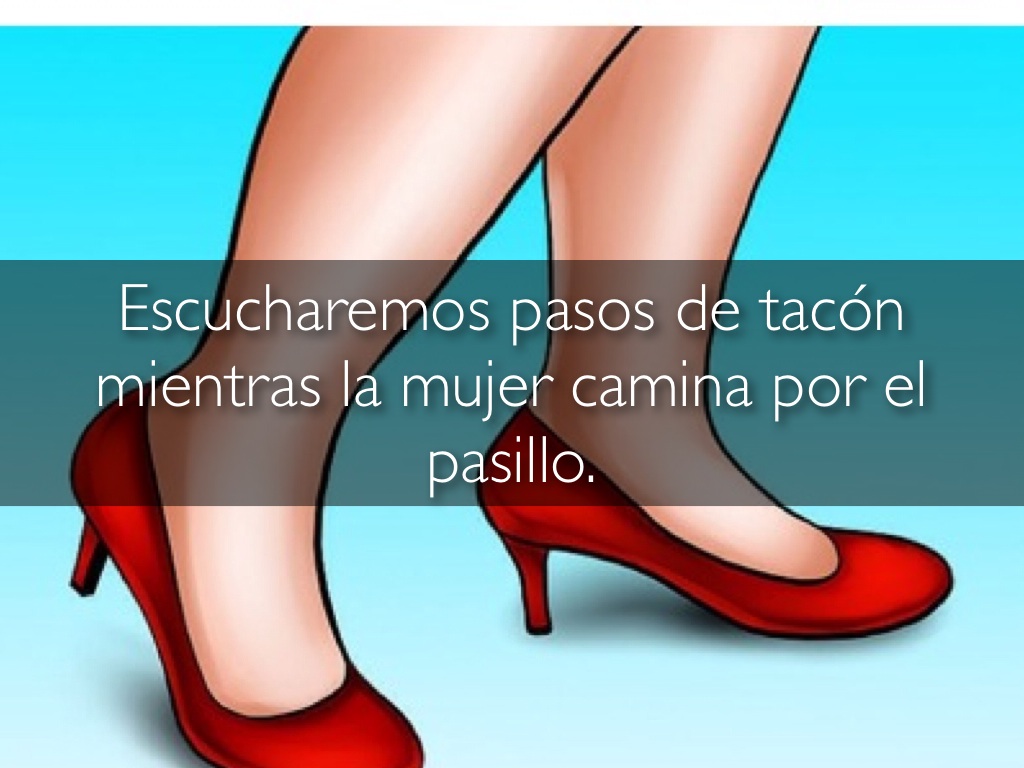 Escucharemos pasos de tacón mientras la mujer camina por el pasillo.