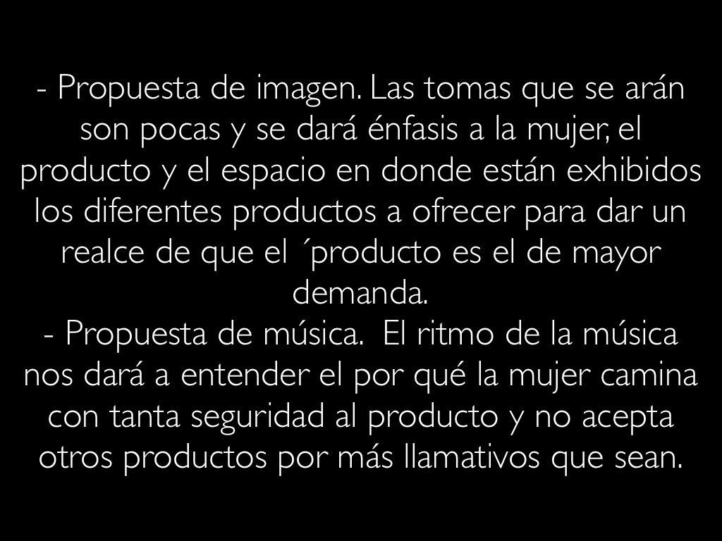 - Propuesta de música. El ritmo de la música nos dará a entender el por qué la mujer camina con tanta seguridad al producto y no acepta otros productos por más llamativos que sean.