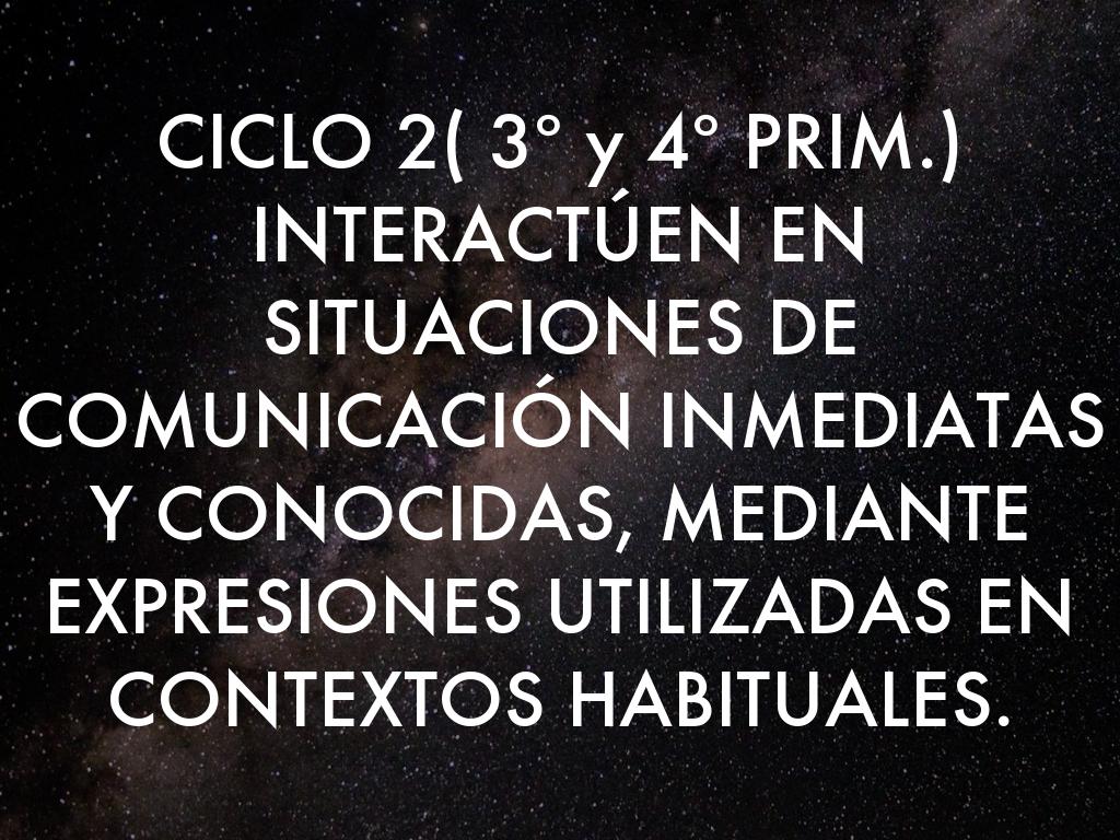 CICLO 2( 3º y 4º PRIM.) INTERACTÚEN EN SITUACIONES DE COMUNICACIÓN INMEDIATAS Y CONOCIDAS, MEDIANTE EXPRESIONES UTILIZADAS EN CONTEXTOS HABITUALES.