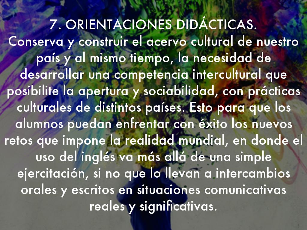 Conserva y construir el acervo cultural de nuestro país y al mismo tiempo, la necesidad de desarrollar una competencia intercultural que posibilite la apertura y sociabilidad, con prácticas culturales de distintos países. Esto para que los alumnos puedan enfrentar con éxito los nuevos retos que impone la realidad mundial, en donde el uso del inglés va más allá de una simple ejercitación, si no que lo llevan a intercambios orales y escritos en situaciones comunicativas reales y significativas.