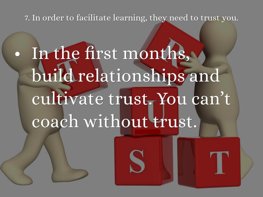 • In the first months, build relationships and cultivate trust. You can’t coach without trust.