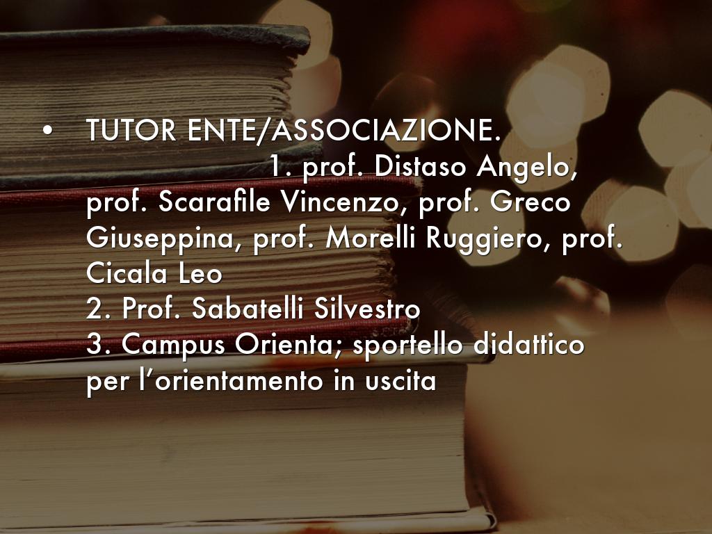 TUTOR ENTE/ASSOCIAZIONE. 1. prof. Distaso Angelo, prof. Scarafile Vincenzo, prof. Greco Giuseppina, prof. Morelli Ruggiero, prof. Cicala Leo 2. Prof. Sabatelli Silvestro 3. Campus Orienta; sportello didattico per l’orientamento in uscita