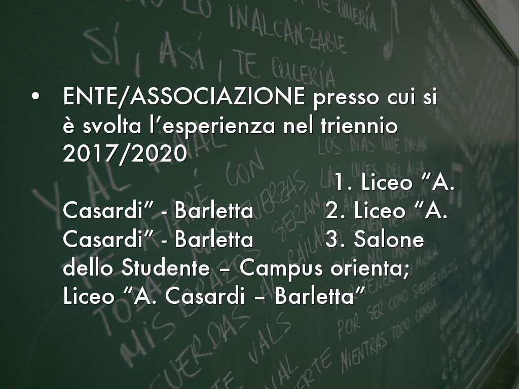 ENTE/ASSOCIAZIONE presso cui si è svolta l’esperienza nel triennio 2017/2020 1. Liceo “A. Casardi” - Barletta 2. Liceo “A. Casardi” - Barletta 3. Salone dello Studente – Campus orienta; Liceo “A. Casardi – Barletta”