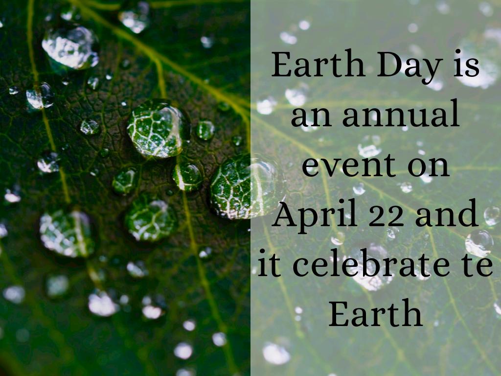 Earth Day is an annual event on April 22 and it celebrate te Earth