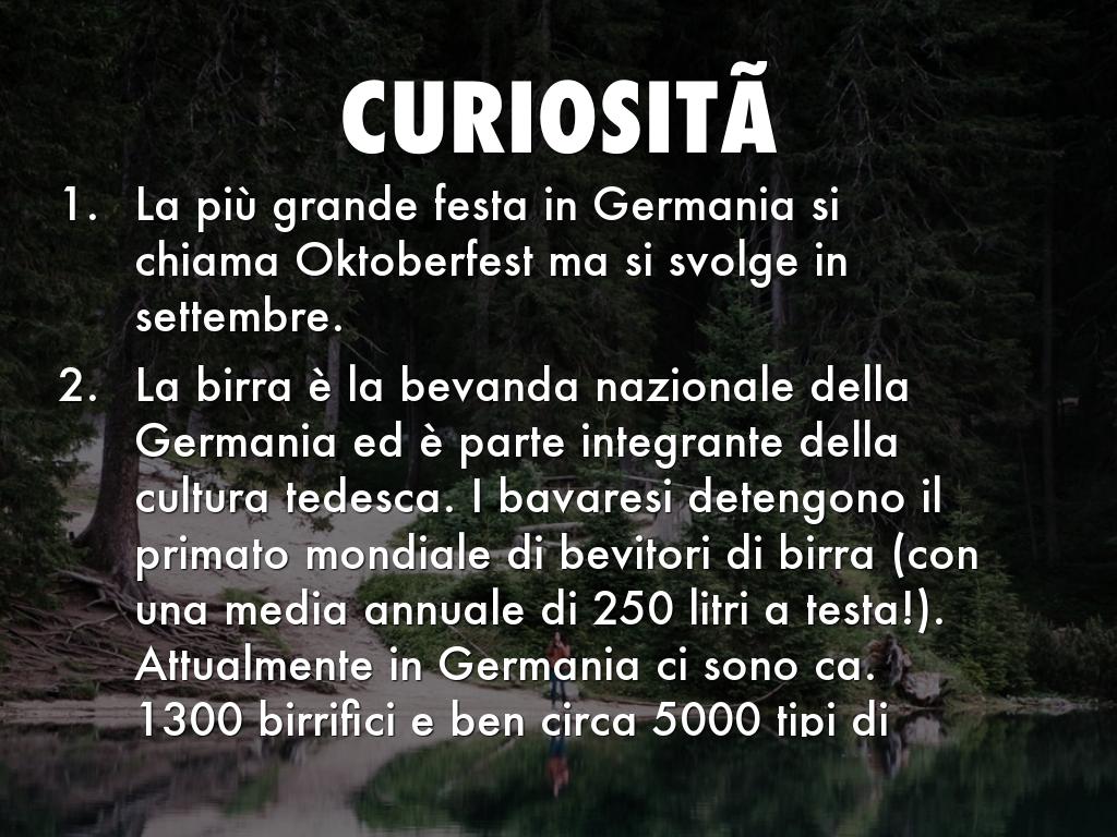 La birra è la bevanda nazionale della Germania ed è parte integrante della cultura tedesca. I bavaresi detengono il primato mondiale di bevitori di birra (con una media annuale di 250 litri a testa!).