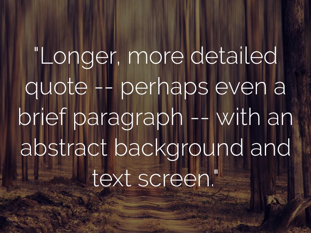 "Longer, more detailed quote -- perhaps even a brief paragraph -- with an abstract background and text screen."
