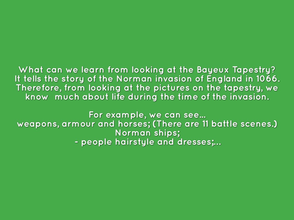 It tells the story of the Norman invasion of England in 1066. Therefore, from looking at the pictures on the tapestry, we know much about life during the time of the invasion.