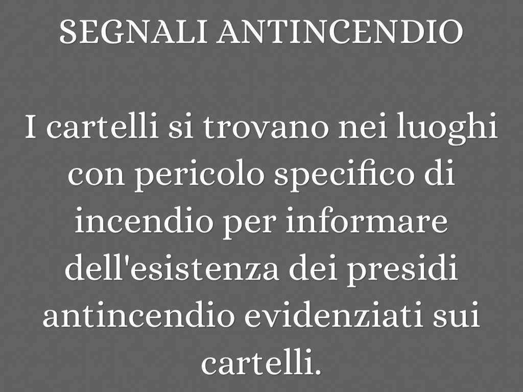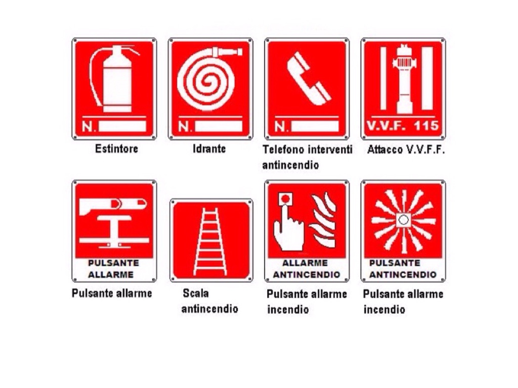 I cartelli si trovano nei luoghi con pericolo specifico di incendio per informare dell'esistenza dei presidi antincendio evidenziati sui cartelli.