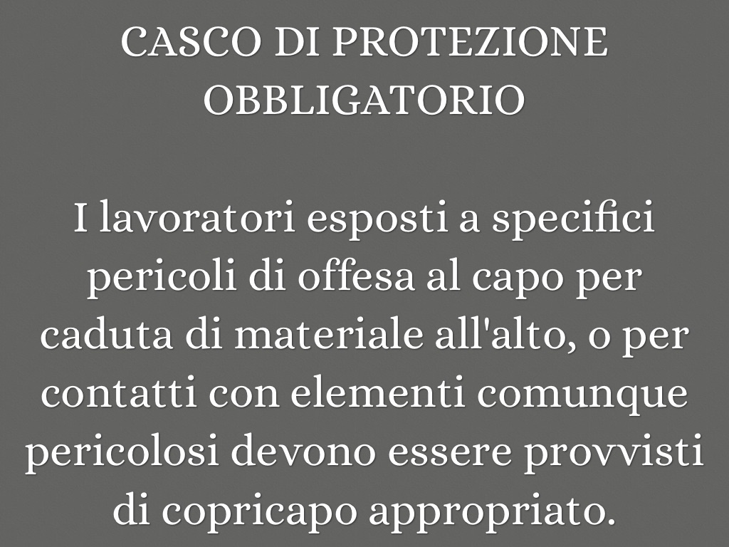 I lavoratori esposti a specifici pericoli di offesa al capo per caduta di materiale all'alto, o per contatti con elementi comunque pericolosi devono essere provvisti di copricapo appropriato.